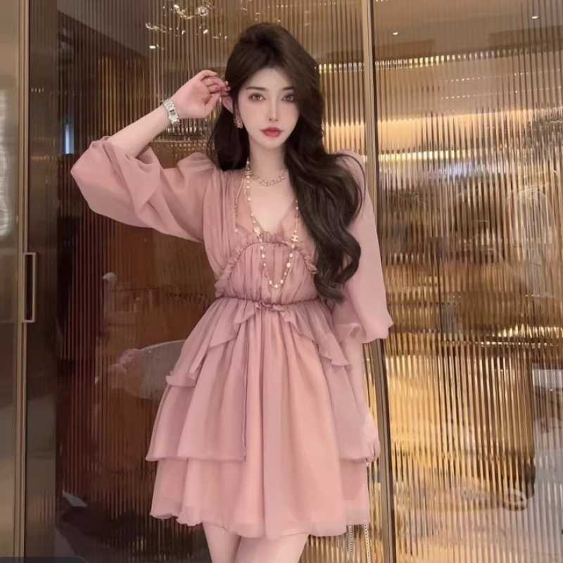 New spring and summer collection: Ruffled small fly-sleeved chiffon floral tea break dress