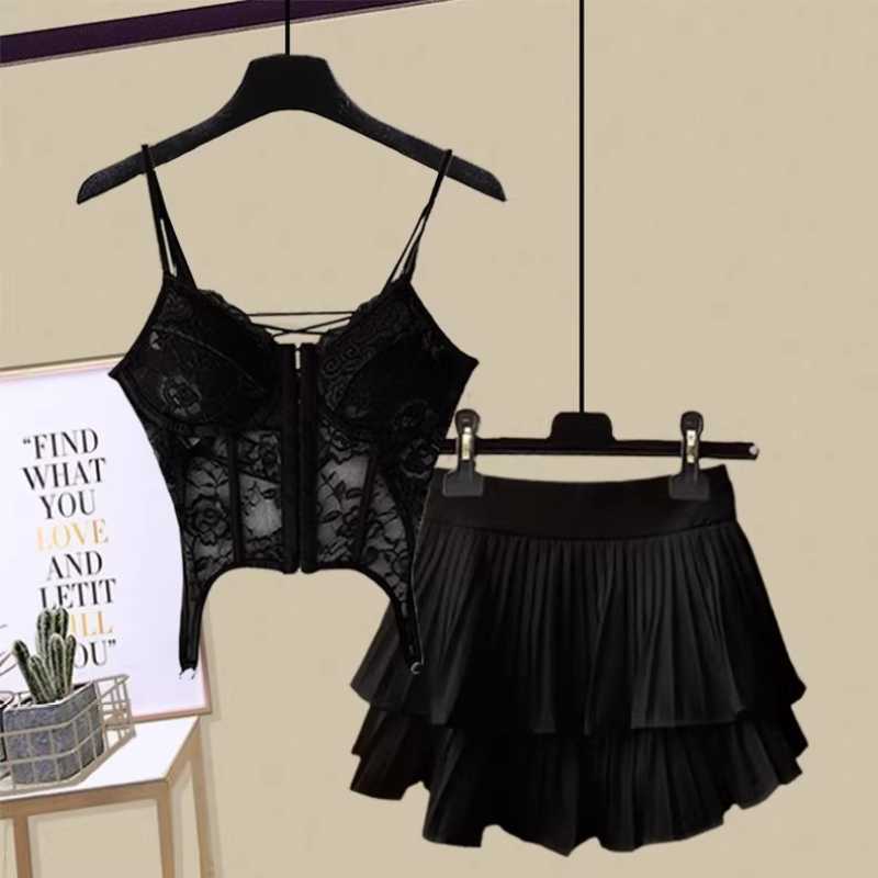 Black lace halter top with pleated skirt suit