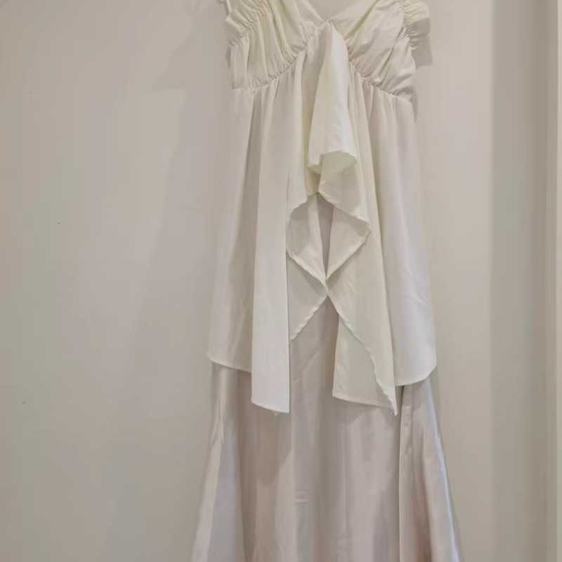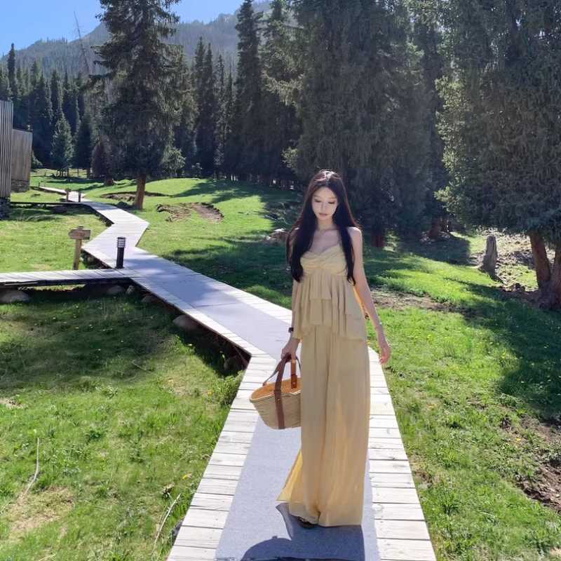 On May 31st, "Can't resist cream yellow" ruffles halter top + side-slit trousers...