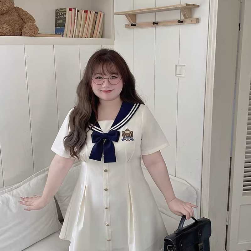 LT STUDIO Spicy Strip plus-size navy collar embroidered youthful and slimming dress