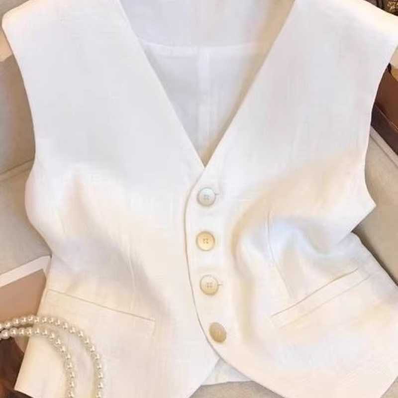 Premium linen V-neck vest, white, versatile style ~