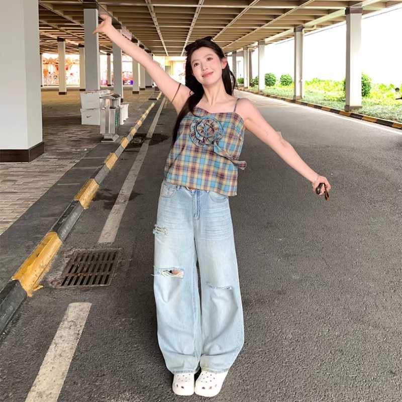 Blue L-size ripped jeans and slimming straight-leg wide-leg pants