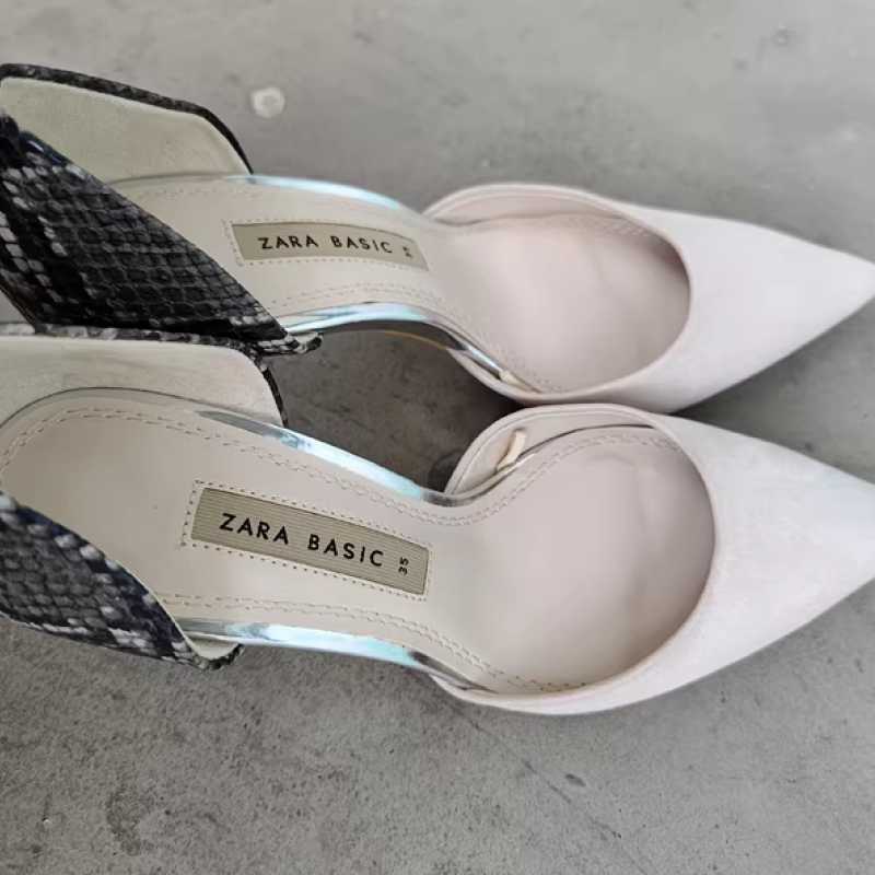 Brand new Zara size 35 high heels with snake-patterned leather and off-white fabric