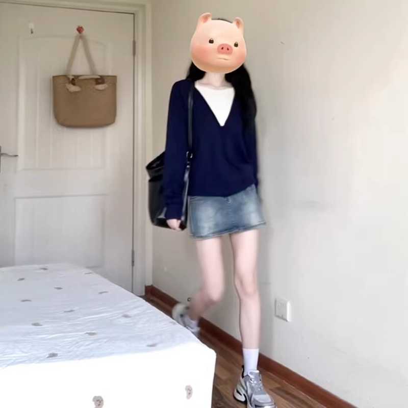 A brand-new high-end navy blue fake two-piece knitted sweater