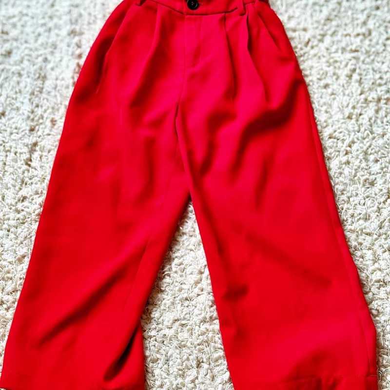 The child model walked the runway in red wide-leg pants
