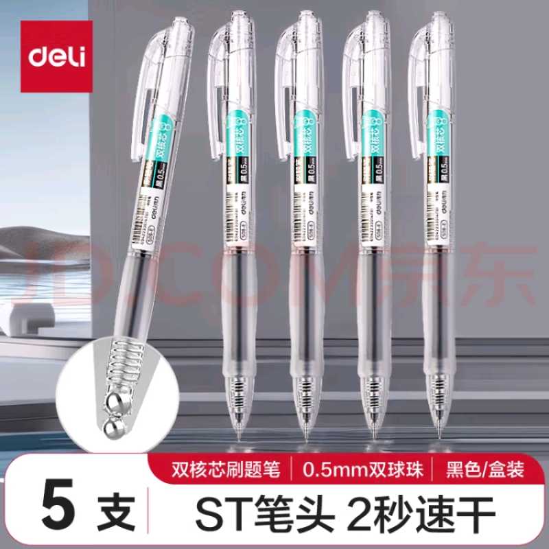 得力(deli)速干按动中性笔 双珠ST笔头 0.5mm学生中性笔刷题笔考试笔 双核芯刷题笔黑色5支/盒S08-E5